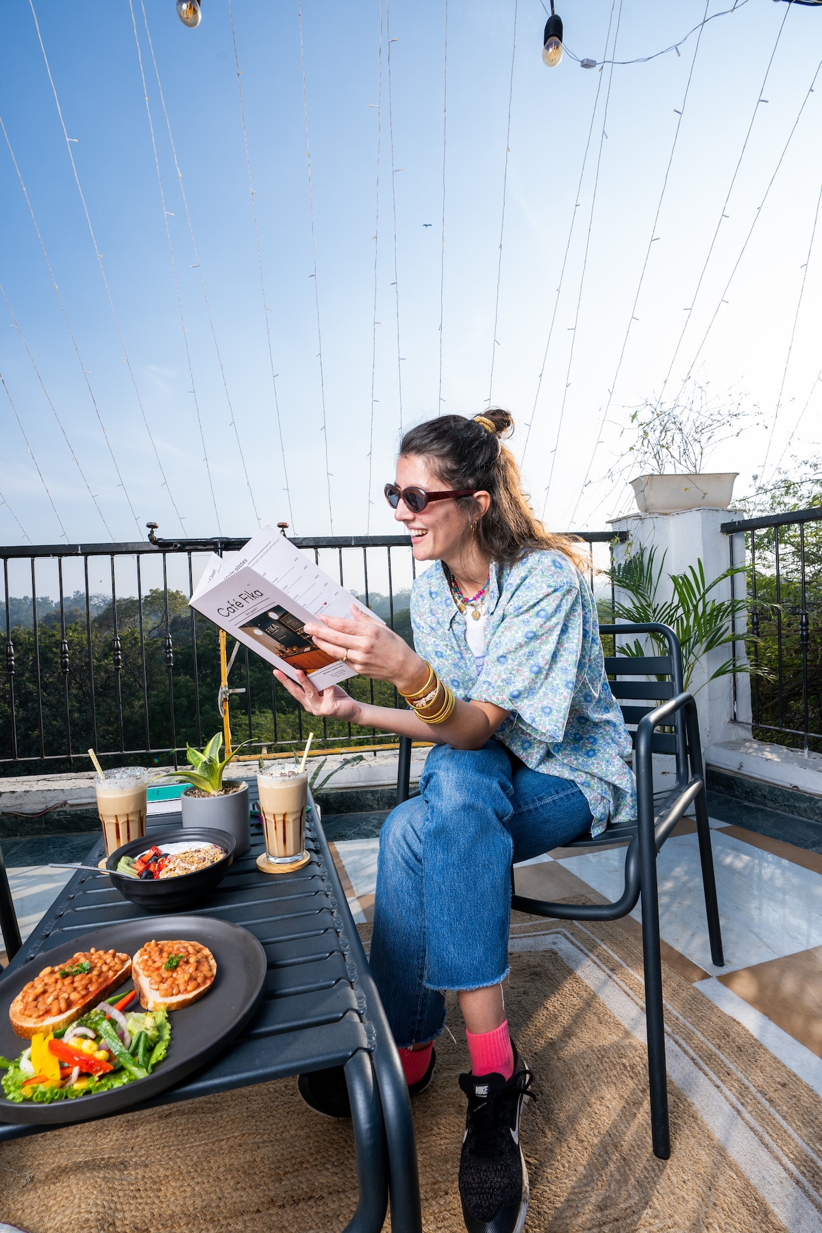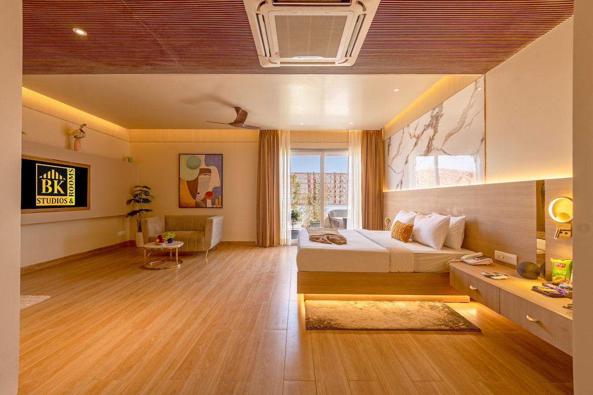 Experience luxury and privacy in this beautiful rooftop suite this modern hideaway combines sophisticated interiors with a serene outdoor retreat — perfect for couples or solo travelers seeking comfort and style. Located on the 5th floor (lift access till 4th), the suite welcomes you with a spacious bedroom, warm lighting, and elegant wooden finishes. Step outside to your private terrace, an oasis designed for relaxation. The highlight — a jacuzzi under the open sky