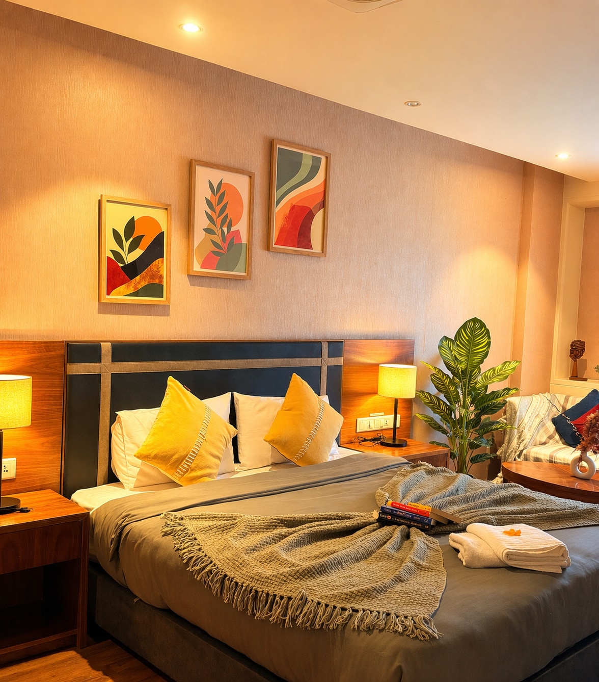 MES Secret Hide-out Bedroom with Lounge - is in the Heart of South Delhi-Gk1, with is a beautiful 1 BHK with a large bedroom having a 65inch TV and 2 x Sofa cum beds and an attached Toilet. A seperate Lounge room with Kitchen and a Sofa cum bed with TV. Also having a front Garden with seating and a nice Sunset view. Sleeping Capacity 4-7 Guests. Total area: 1000Sqft. Note: 7th April'25 checkin time 530pm