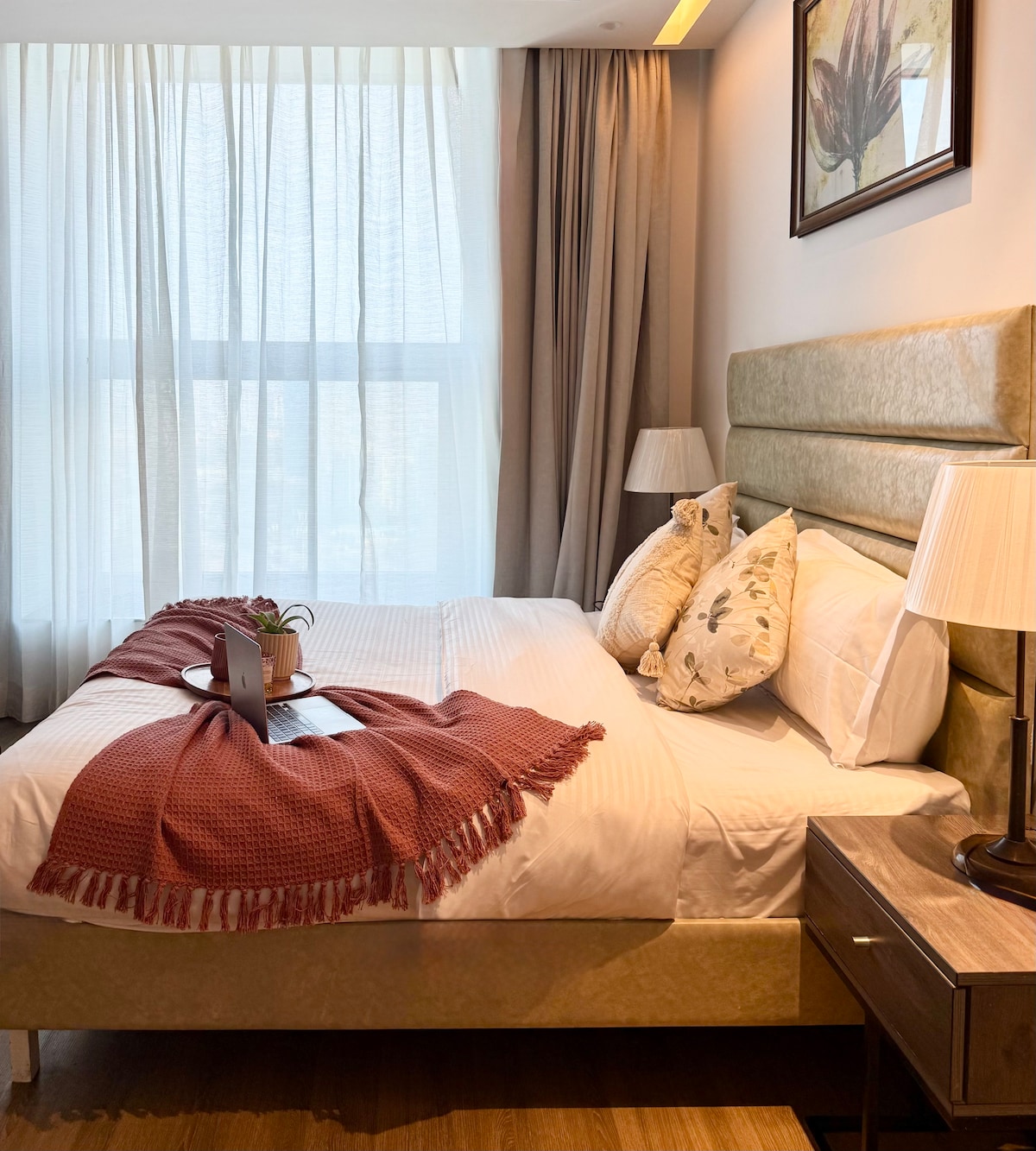 Welcome to our amazing suite which is situated on 15th floor of a high rise building. This 2bhk is completely fresh apartment. Wide private patio with city skyline view makes it unique in class. The place is perfect for relaxing and enjoying scenic view of modern architecture. Apartment is loaded with 3 smart tvs (all applications works), 2 cozy double bed, 2 big wardrobe with locker, 6 seater sofa, stylish coffee table,iron board, fridge,microwave,induction,electric kettle, toaster & much more