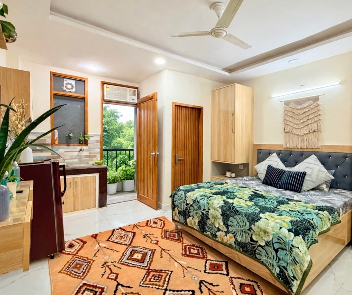 Stay at our spacious 2BR Park-View Retreat, 8.5 km from airports & 15 min ride to the metro. Enjoy airy balconies, park views, mahogany/wooden beds, a fully-equipped kitchen, high-speed Wi-Fi, Smart TV, complimentary toiletries, & local recommendations. Relish home-cooked meals, explore nearby market & malls, and unwind with serene jogging paths. Experience top-notch hospitality with flexible check-in/out, laundry services & optional airport transfers. Book now for a memorable Delhi stay!