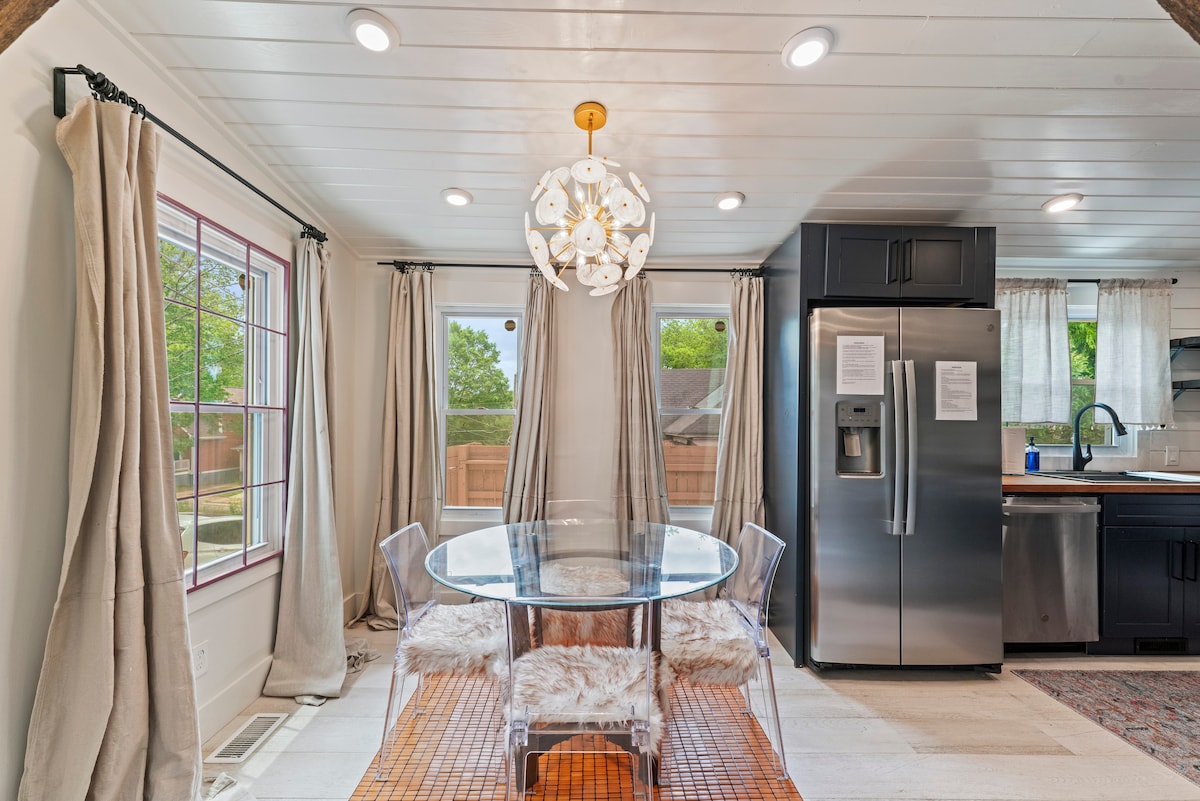 Make breakfast under the gabled ceiling of a pristine kitchen boasting vintage 1940s Youngstown kitchen cabinets. Combining white wood shiplap, oak scrap hardwood floors, and powder blue accents, this gorgeous home is steeped in historic charm. Expect to enjoy the natural light gleaning through the beautiful stained-glass windows. A rusted tin roof tops off this charmer, but it's the rainy nights where the rusted tin truly speaks to you.