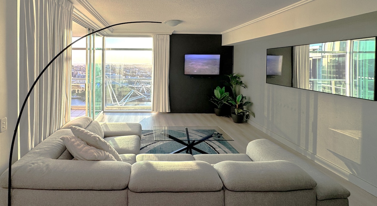 Our apartment is set on level 20 rising high above the city with 180° uninterrupted views of the beautiful Brisbane river from the living room. Thoughtfully decorated and furnished, this apartment will be the perfect base for you to explore and experience all that beautiful South Brisbane has to offer. Leave your car parked and walk to South Bank Parklands , GOMA, QPAC, Star Casino and experience the wonderful restaurants of South Brisbane and West End. A 15 walk to Suncorp stadium!