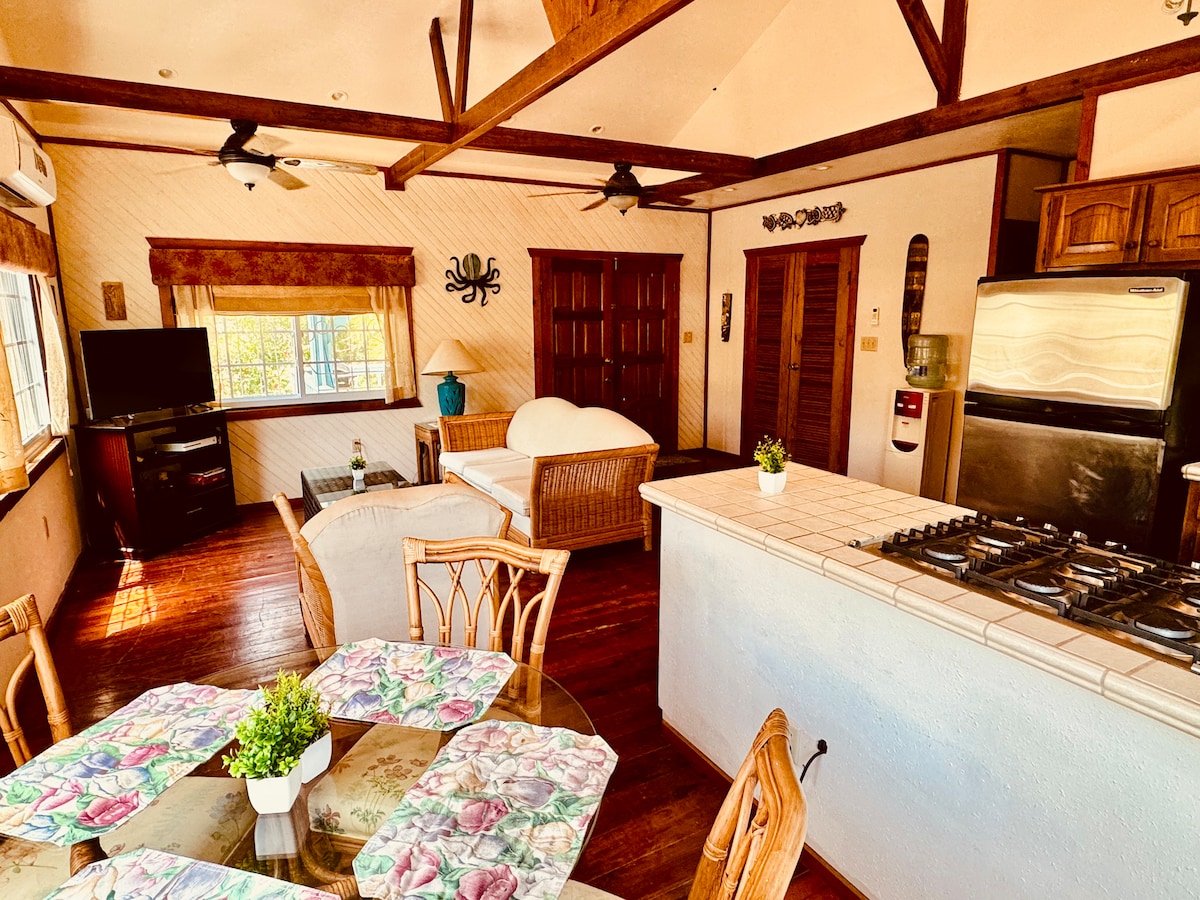 Forget your worries in this tranquil and serene place. This is 2nd brand new wooden house on our beach property with Ocean view, it's 2 store house, downstairs is kitchen with living room area and half bathroom, upstairas is bedroom with full bathroom and porch with hammock. It's on private beach, with Ocean view and access to the dock to snorkel and relax