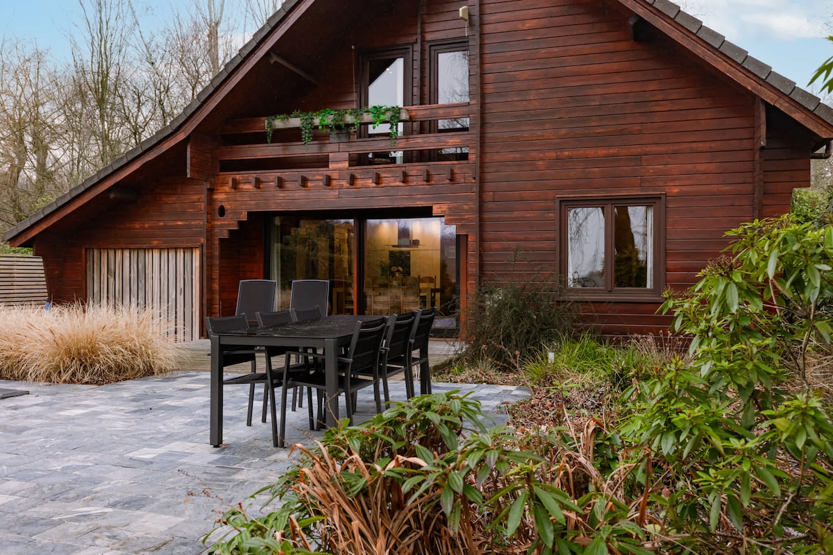 A warm timber chalet in the heart of East Flanders' largest forest. High ceilings, natural wood throughout, a private garden with pond, and silence as standard. Walk ancient trails from the front door, explore the Gnome Trail with the kids, or simply unwind on the terrace with a glass of wine. Sleeps 5. Between Ghent and Bruges. This is what a real escape feels like.