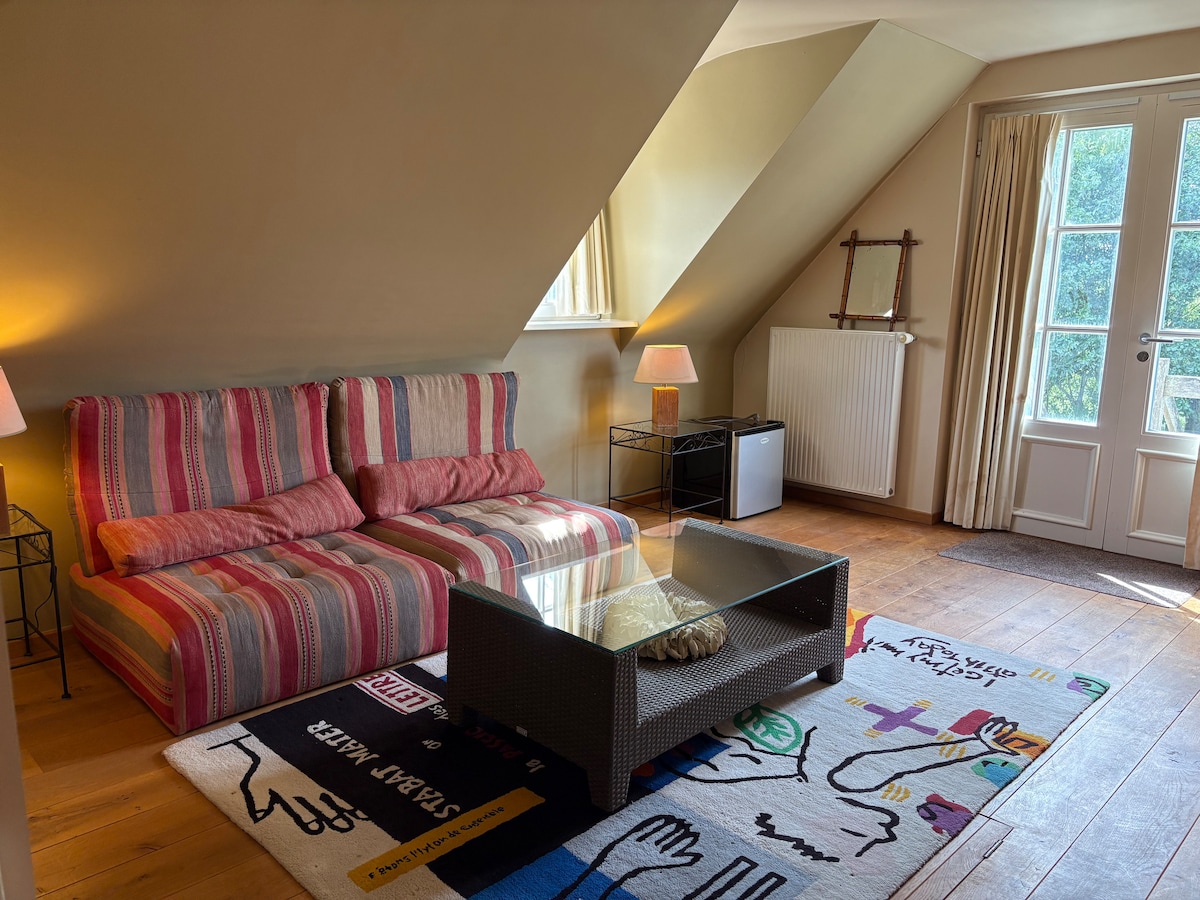 Unieke, ruime suite in perfecte staat met private douche en lavabo in uitzonderlijk mooi herenhuis Gratis 3 croissants per persoon voor het eerste ontbijt Nespresso Koffie en thee voor eerste dag Regendouche Nieuw bed (2024) Variëteit aan hoofdkussens Yogamat Inchecken vanaf 14 uur De straat oversteken en je bent in het historische centrum Bus in alle richtingen op 1 minuut Let wel: toilet is op de gang en wordt gedeeld met 1 andere gastenkamer Ga eerst even door de huisregels