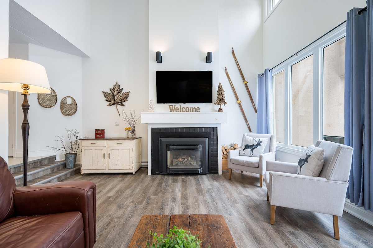 We would love to share our vacation chalet with you. This ski chalet has everything and more! We have an outdoor Hot Tubs, an indoor Sauna, and Entertainment such as a Pool Table, video games and a large 75 inch HD TV for your movie nights. Surround your friends/families around our renovated Kitchen, large Centre Island and large Dining Room Table. Seat in our covered Sunroom to have a morning coffee or enjoy your BBQ food all year round. Only 7 min walk to the Village