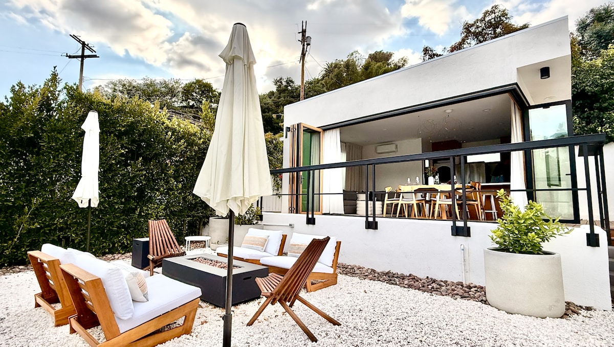 This secluded, gated, lux retreat with stunning views sits on over 1 acre in a country-like setting with easy access to LA activities. Resort features include steam shower, filtered water, fire pit, pool, hammock, Alexa, 50” TV , hi-speed wi-fi, printer, desk, Nespresso coffee maker, BBQ w burner/pots/pans, remote controlled black out blinds, private patio, with luxury amenities and designer details. For reservations more than 3 months in advance, please inquire.