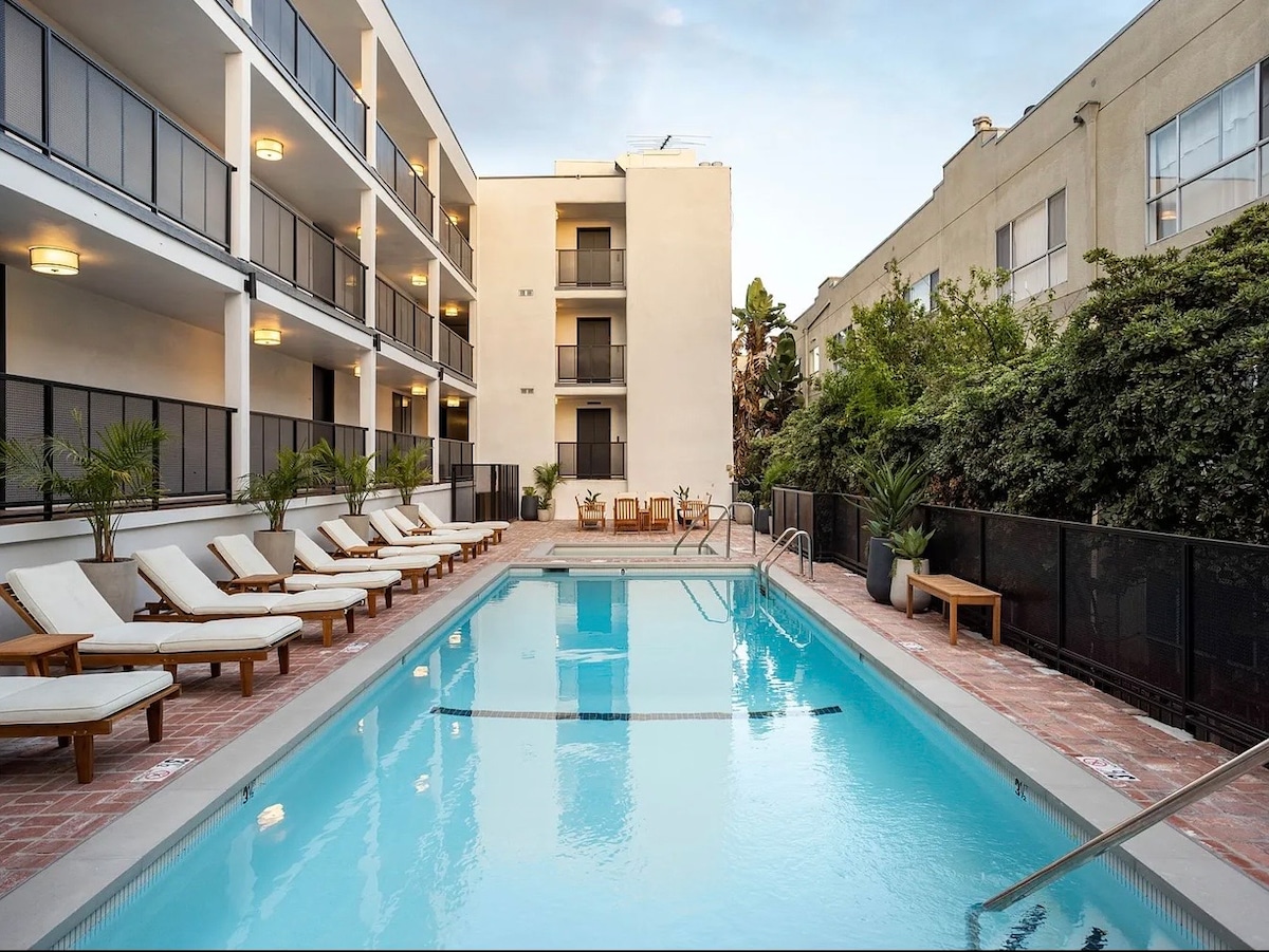 Custom Designed spacious apt with lovely courtyard view near Santa Monica Blvd, La Brea and Studios! ⚜️Walker's Paradise! Walk to Coffee shops, Cafe's, Shopping, Restaurants. ⚜️ Come and go with ease and privacy. ⚜️Self Check-In •⚜️3 Smart Roku TV's ⚜️ Secure hi speed Wifi ⚜️ 2 plush King beds, Queen Couch Bed, single fold up. ⚜️ Resort Style 24 hr gym, pool, and spa