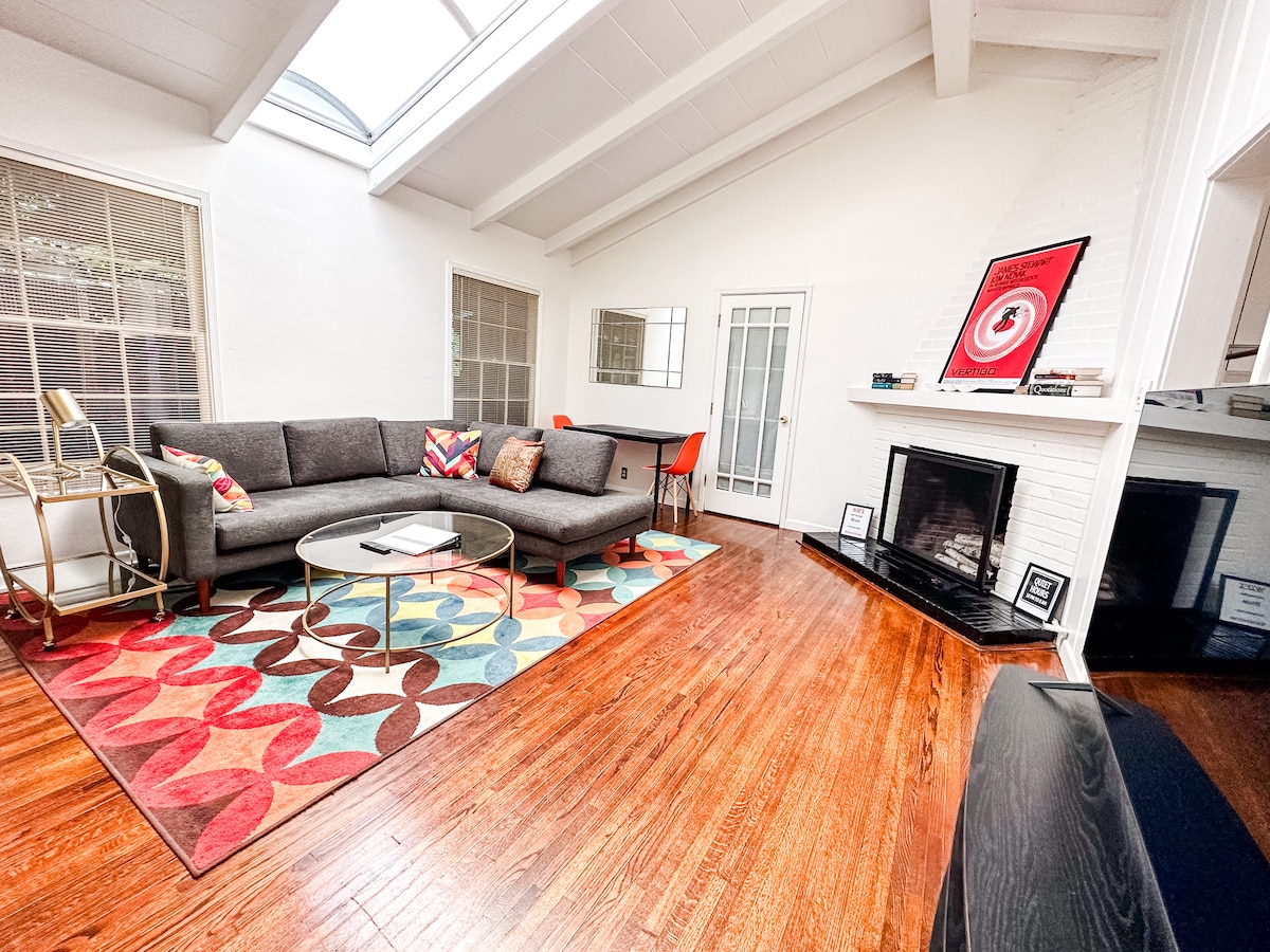 Midcentury modern 2bed/2bath stilt home with spectacular views above Sunset Strip (2 blocks up from Hollywood + Fairfax). Only blocks from the action, but very private and quiet. Recent renovations from roof to foundation, heat/AC system, 1 Giga/sec wifi, wired in + out with 11 speakers, movie projector + two 4k TVs (free Netflix, HBOMax and AppleTV+), 2-car parking with level 2 electric charger. Please note: No social gatherings or late, loud nights. Interior = 1015 sq ft. Deck = 300 sq ft.