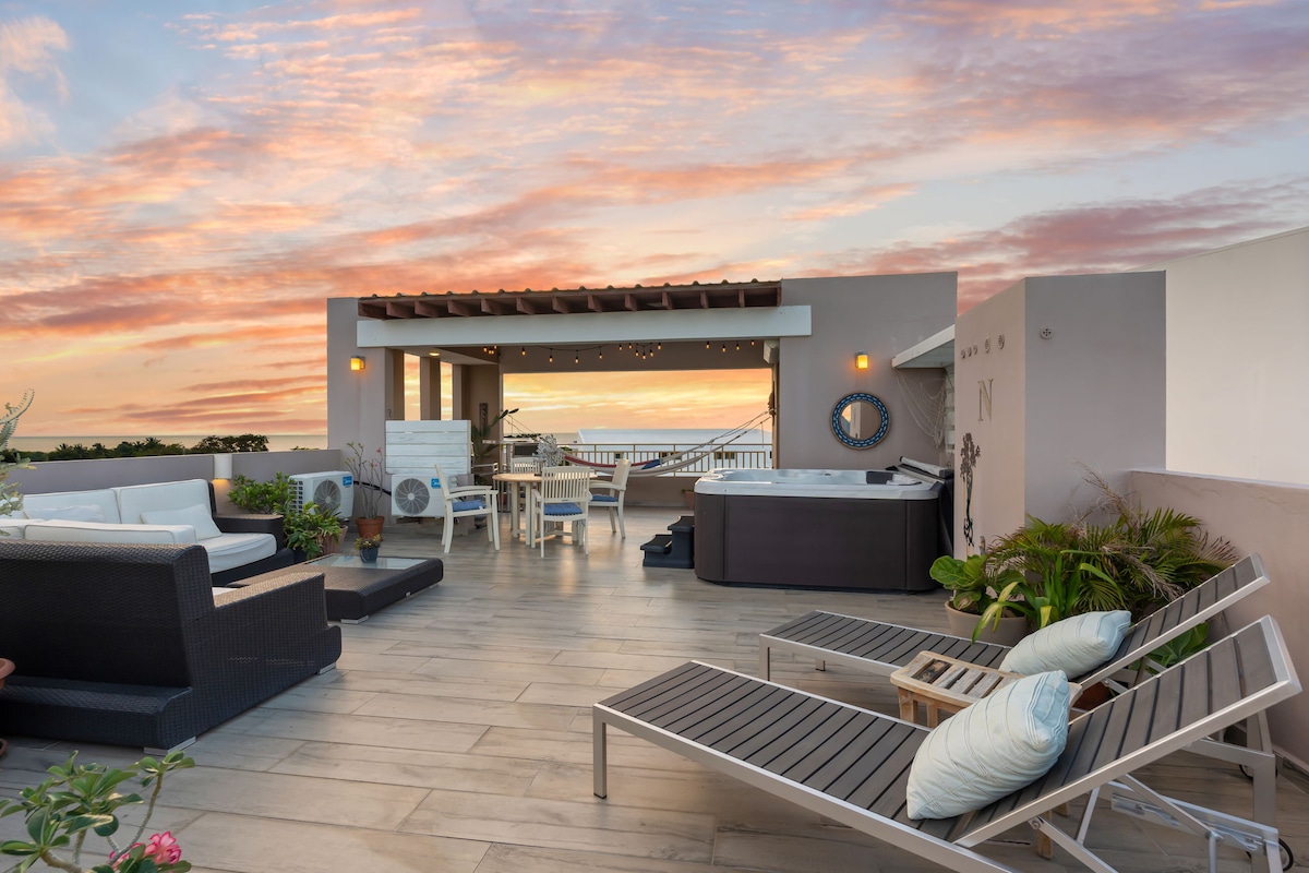 Newly renovated penthouse with three private parking spaces. The master bedroom has a balcony, and the home includes a fully equipped kitchen, smart TVs, and luxury bathrooms. Enjoy 360° views from the rooftop terrace with private hot tub. The property offers a main and children’s pool, basketball court, and playground. Just a five-minute walk to Combate Beach, restaurants, bars, and a public boat ramp.