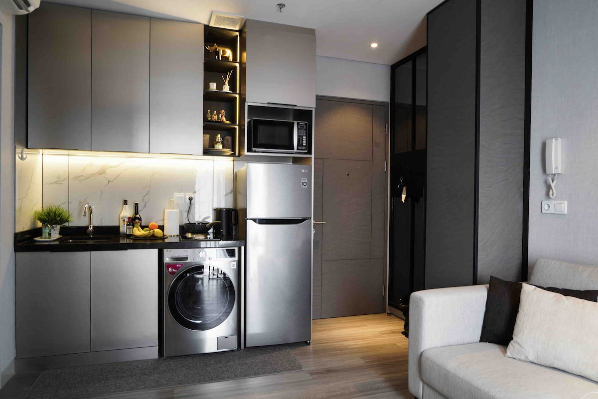 An elegant 24sqm studio in Jakarta's center, blending style and convenience. Includes kitchen, fast Wi-Fi, air-purification, 43" smart TV, sound system and Netflix. It is ideal for various stay types, with contactless access and amenities like pools, jacuzzi, gym, and basketball, Now features a Reverse Osmosis dispenser & food waste disposal, The picture shows a gas stove that has been replaced by an induction cooker (to follow the apartment guidelines for fire hazards)