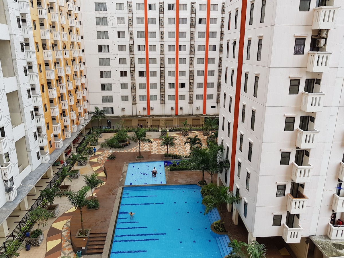 A brand new and simple but comfy studio apartment located in a 4 star hotel compound. Pool and Gym, hotel facilities are free to use. 24hrs Circle K is just across the street. Restaurants, Laundry and other shops are just a walking distance. Direct Bus Service to Jakarta's Soekarno Hatta's International Airport is just at the entrance of the Hotel with a budget friendly rate and comfortable seats.(Rp.55K/pax as Oct 1,2019) Overall staying at our place is strategic and full of basic facilities.