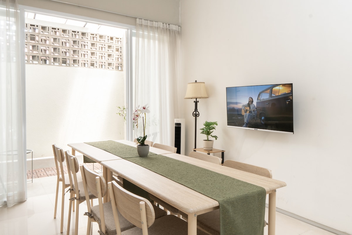 Casa 42 is a 5-bedroom house with 5 AC that can accommodate up to 15 guests and is about 5 km from the city center. 10 guests will be sleeping on 6 beds and the other 5 guests will be on the travel beds. All 4 bathrooms have hot water. Towels, bath amenities, iron & a washing machine are provided. A Rice cooker, microwave, BBQ grill pan & cutlery are available. Netflix, TV & Wifi are free. A carport for 2 cars is available (size 5 x 6 m) Maximum car height for entrance is 2.4 meters.