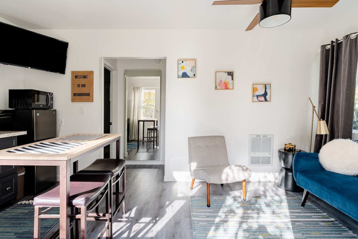 A portion goes to Airbnb "Open Homes" program to help people in need Central location. Gorgeous stately home in Historic neighborhood, with unbelievable views Lovely, quiet, and safe. All the amenities you would need Private Studio- comfy full bed + hide-a-bed, 3/4 bath 24 hr self check-in + free gift upscale l neighborhood, nice gardens. See reviews! Fun, Cute & Quirky TINY kitchenette, fridge, microwave, coffee, tea, water, plates, etc NOTE: Clean but NOT spotless...no bad reviews pleeease!!