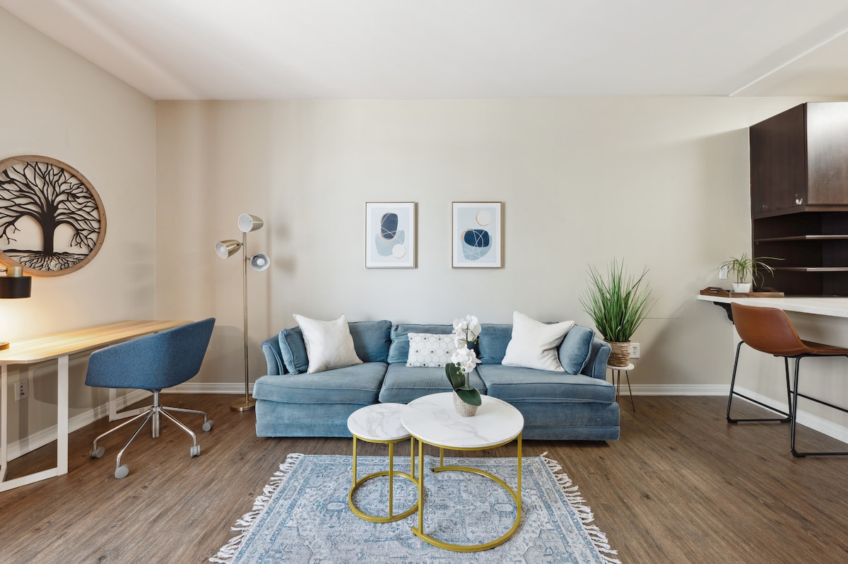 Welcome to your cozy Santa Monica stay! Bright, spacious, and modern one bed/one bath in the heart of downtown Santa Monica. Your home away from home is only a short and beautiful walk to the Pier, Beach, Third Street Promenade, and Santa Monica Place. Whether you're in town for work or vacation, this space is perfect! Enjoy a private balcony, comfy queen bed with hotel-style linens, fast Wi‑Fi, equipped kitchen, full bath, easy self check‑in, and a parking garage for your convenience.