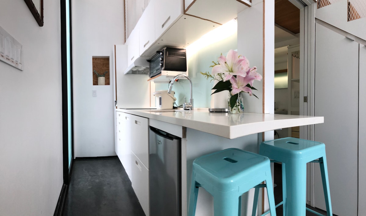 Safe, welcoming oasis in one of the most iconic cities! Gated, Private Mid-Century Design Guesthouse with Kitchen, Bathroom, Living Room with large windows with courtyard views. Free Street Parking (road is busy during rush hour). Fiber Internet. Gated. Patio. Loft (has low ceiling, stairs). Close to Beverly Hills, UCLA, Santa Monica, Hollywood. Beaches, Surfing, Boats in 20-30 mins. Enjoy our OG Tiny Home Guest House! Stairs. Low ceiling in loft. May not be ideal for those with mobility issues.