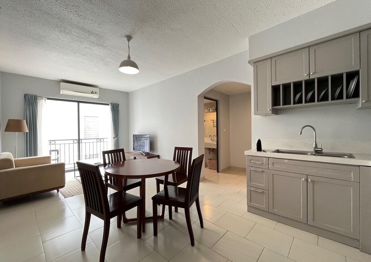This beautiful apartment in Tay Ho is located on the 6th floor of our new building - Hanoi Housing 32. It has one bedroom, one bathroom, and an open livingroom-kitchen. It is nicely designed. Full modern furniture and equipment is provided. The wooden floor helps the apartment easy to clean. Moreover, the building's location is within walking distance to convenience stores, restaurants, shops, bars, pubs. Please note that there is no natural light or balcony at the apartment