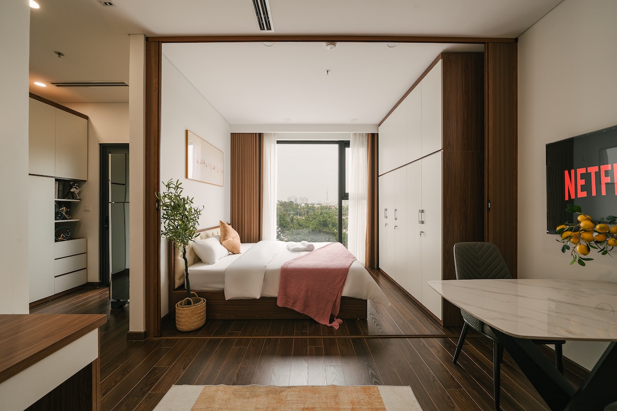 Hello! Your studio apartment is 38m2 high-class like a luxurious and charming 5-star hotel with a comfy bed, private bathroom, kitchenette and a balcony overlooking the West Lake. Especially, you have access to a high-class gym, swimming pool and sauna. Are you traveling, on business trip or simply looking for a private and romantic place? It is a great choice for you, Let’s come and experience! We’re excited to see you here! Best regards, Luxury Econest team
