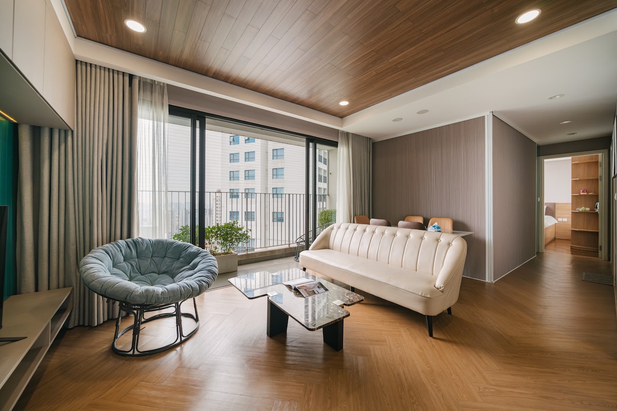 This beautiful apartment in Tay Ho is located on the 6th floor of our new building - Hanoi Housing 32. It has one bedroom, one bathroom, and an open livingroom-kitchen. It is nicely designed. Full modern furniture and equipment is provided. The wooden floor helps the apartment easy to clean. Moreover, the building's location is within walking distance to convenience stores, restaurants, shops, bars, pubs. Please note that there is no natural light or balcony at the apartment