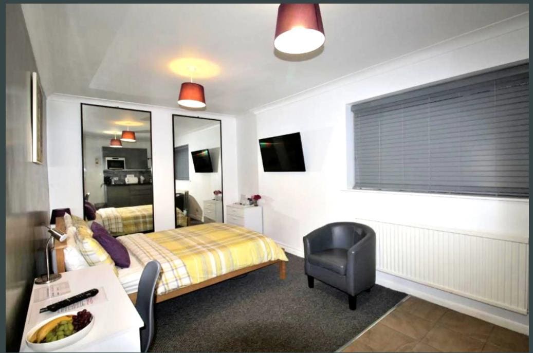 This is a cozy ground-floor room with own bathroom en-suite , a private entrance to the garden, choice of breakfast cereal included in the room, There’s no cooker or oven, but there’s a microwave. Electric and gas central heating, and everything you need like plates, cutlery, and towels is provided. Fantastic Italian restaurant over the road, closed on Sun, Mon, but there are local food delivery services and Tesco nearby with a pharmacy within 2 miles. You can check yourself in with a door code