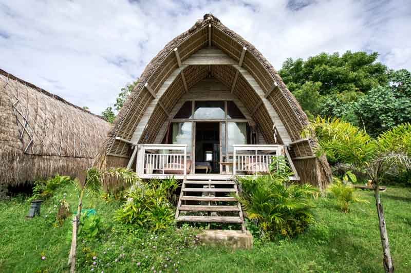 Gipsy Beach Bungalows are located in South West Lombok, on the Sekotong Peninsula facing the 11 Sekotong Gili Islands. The islands are sprinkled in the bay in front of the resort making a lovely landscape. We have two traditional lumbungs in recycled timber and thatched roofs. They are spacious (40m²) and comfortable, each with ensuite bathroom with shower and natural stone floors.