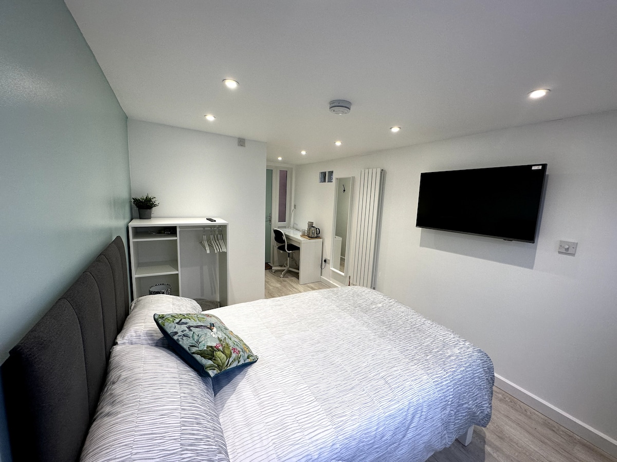 A cosy, self-contained, high-quality garage conversion with a contemporary en-suite bathroom, smart TV, and personal workstation. Perfect for a working professional or couple visiting the city. Access is via a lit driveway where guest can park. The modern space is situated in the desirable area of Kings Heath and is only a few minutes drive from the heart of Moseley and various local attractions. The city centre is less than a 20-minute car drive away or accessible by a 35-minute bus ride.