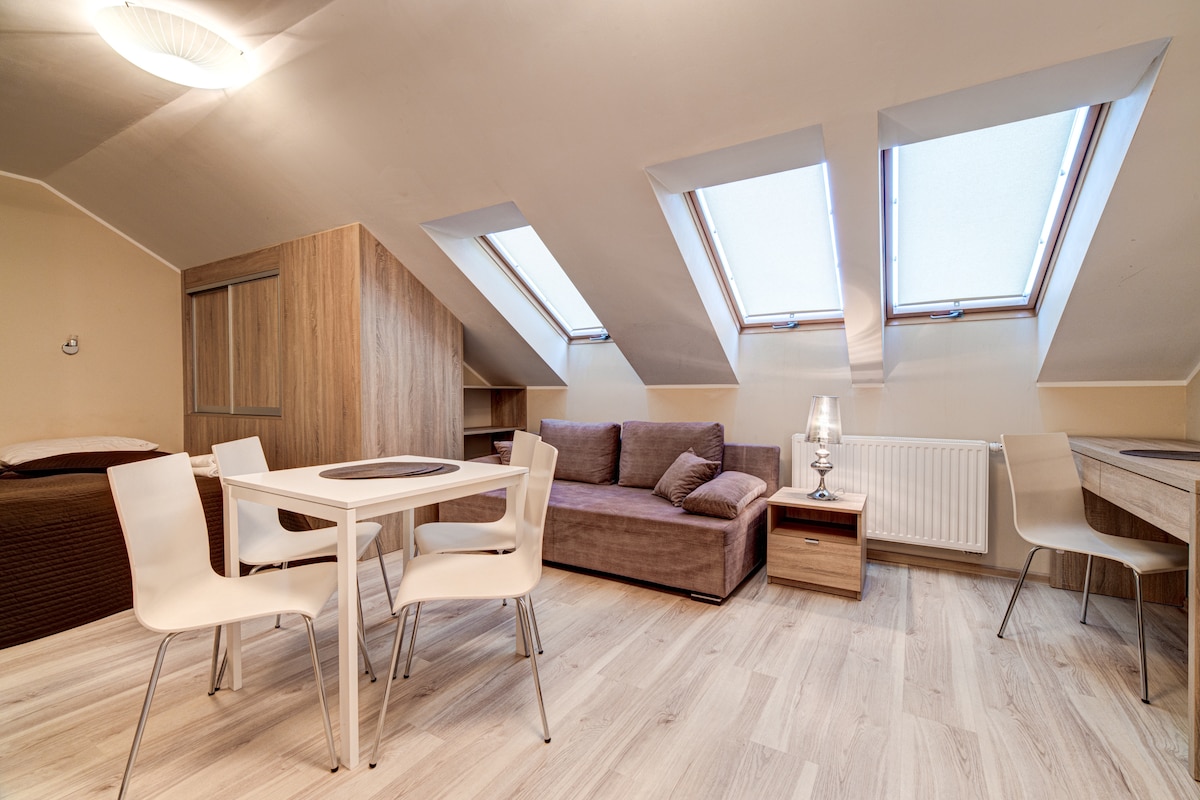 Przepiękny apartament z nowoczesnym wystrojem. Przestronne wnętrza zapewniają komfortowy wypoczynek. W apartamencie znajdują się duże okna, dzięki czemu przez cały rok panuje we wszystkich jego pomieszczeniach można cieszyć się promieniami słonecznymi. Jest idealnym miejscem na wypoczynek w podróży służbowej czy podczas romantycznego weekendu. Kuchnia: - lodówka - zlewozmywak - czajnik - płyta grzewcza - sztućce i naczynia - stół Salon: - łóżko - sofa - TV Łazienka: - prysznic - umywalka - wc