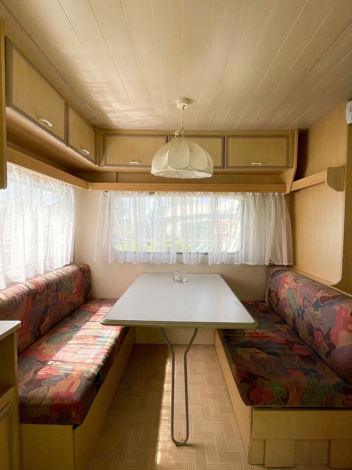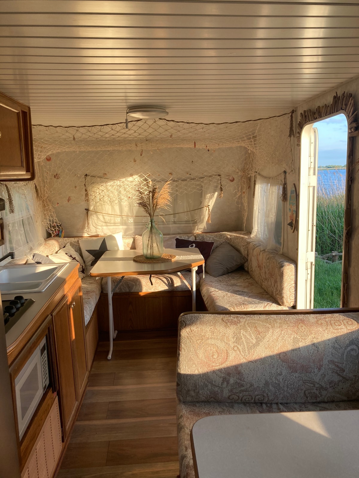 Welcome to one of our RV with handmade decorations! Wake up in nature and enjoy a morning yoga session or coffee on our wooden terrace with a lake view. We're based on a camping site by the lake "Resko", 5 minutes walk from the seaside. Your caravan is equipped with a fridge. There are 2 double beds and 2 single beds. Bathrooms are shared with the rest of our campsite community. There are multiple toilets and showers. Feel free to ask us questions. Can't wait to see you at our oasis :)