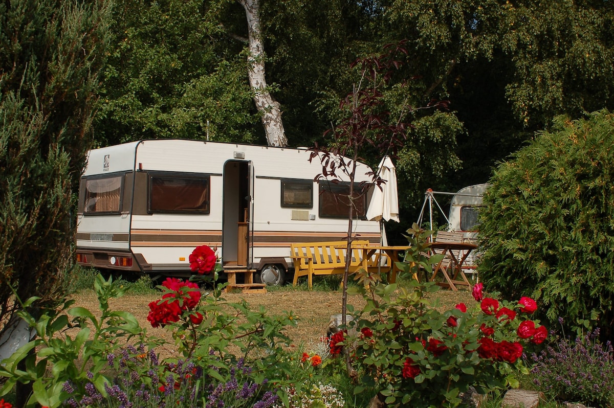 Welcome to one of our romantic caravans! Wake up in nature and enjoy a morning yoga session or coffee on our wooden terrace with a lake view. We're based on a camping site by the lake "Resko", 5 minutes walk from the seaside. Your caravan is equipped with a fridge. There is a double bed and one single bed for a child. Bathrooms are shared with the rest of our campsite community. There are multiple toilets and showers. Feel free to ask us questions. Can't wait to see you at our oasis :)