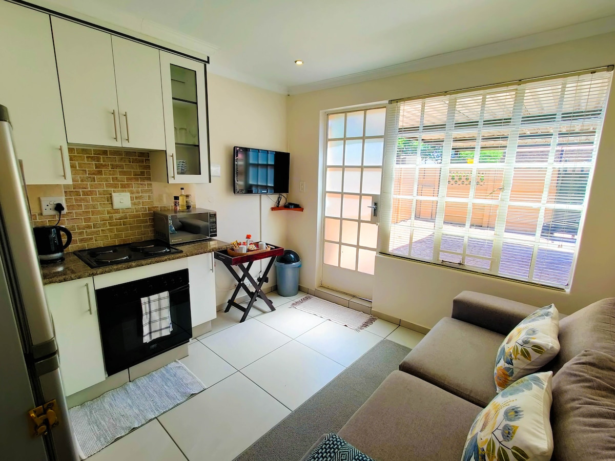 This up market unit is perfect for a home away from home. Lock up and go, secure safe suburb , set in beautiful garden. Easy access to Highways. Comfortable King size bed for great nights sleep. Suitable for short or long term rental, staycation, celebration or business trip. Serviced daily except Sundays and public holidays! Unit comes with one parking bay. Lights, TV and WiFi available during load shedding! Property has a borehole with purified water. Unit has an aircon.