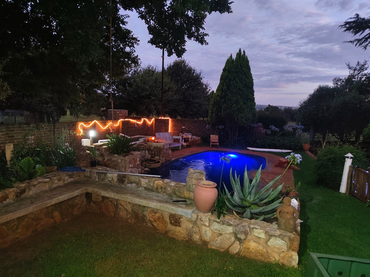 Airy and sunny level accommodation . Plenty of space to relax , while enjoying the highveld weather. Sit and enjoy your morning coffee in a colourful garden , Watching the bird life . New paved area with table and chairs, a braai on request. Please bring your own charcoal. Now with back up power ⚡️and water 💦