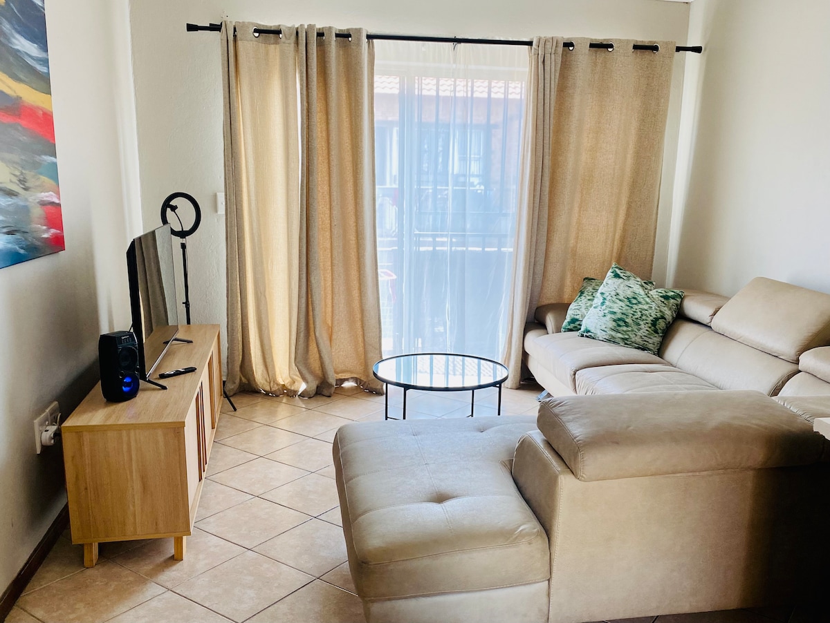 Nyne9 Apartments presents this lovely one bedroom apartment in a Golf Estate. A peaceful environment perfect for a staycation or a business trip. Our apartment is beautifully decorated creating a cozy vibe. The estate offers activities such as golfing, swimming and a clubhouse where you can enjoy the best food. The balcony is private and you can enjoy a delicious braai with some cocktails. The is an alternative battery that can power the tv or WiFi for up to two hours.