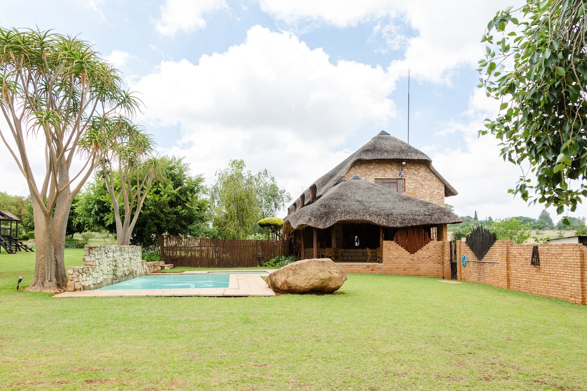 Lovely Cape Dutch style accommodation in the heart of Magaliesburg. Beautiful lawns and a lovely swimming pool with grazing cattle in the background. Escape from the city.
