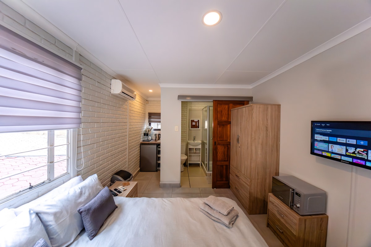 Modern studio in the heart of Poortview. With views onto our indigenous garden, or sit on the patio and watch the horses. Fresh and modern with all the amenities you need. Within minutes of Monash University, Walter Sisulu Botanical Gardens, Lanseria, Cradlestone Mall, MTN and FNB/Wesbank. 5 Minutes from direct highway access (N4) and perfectly situated for exploring the famous Cradle of Mankind. Perfect launchpad for traveling to Sun City, Pilanesberg.