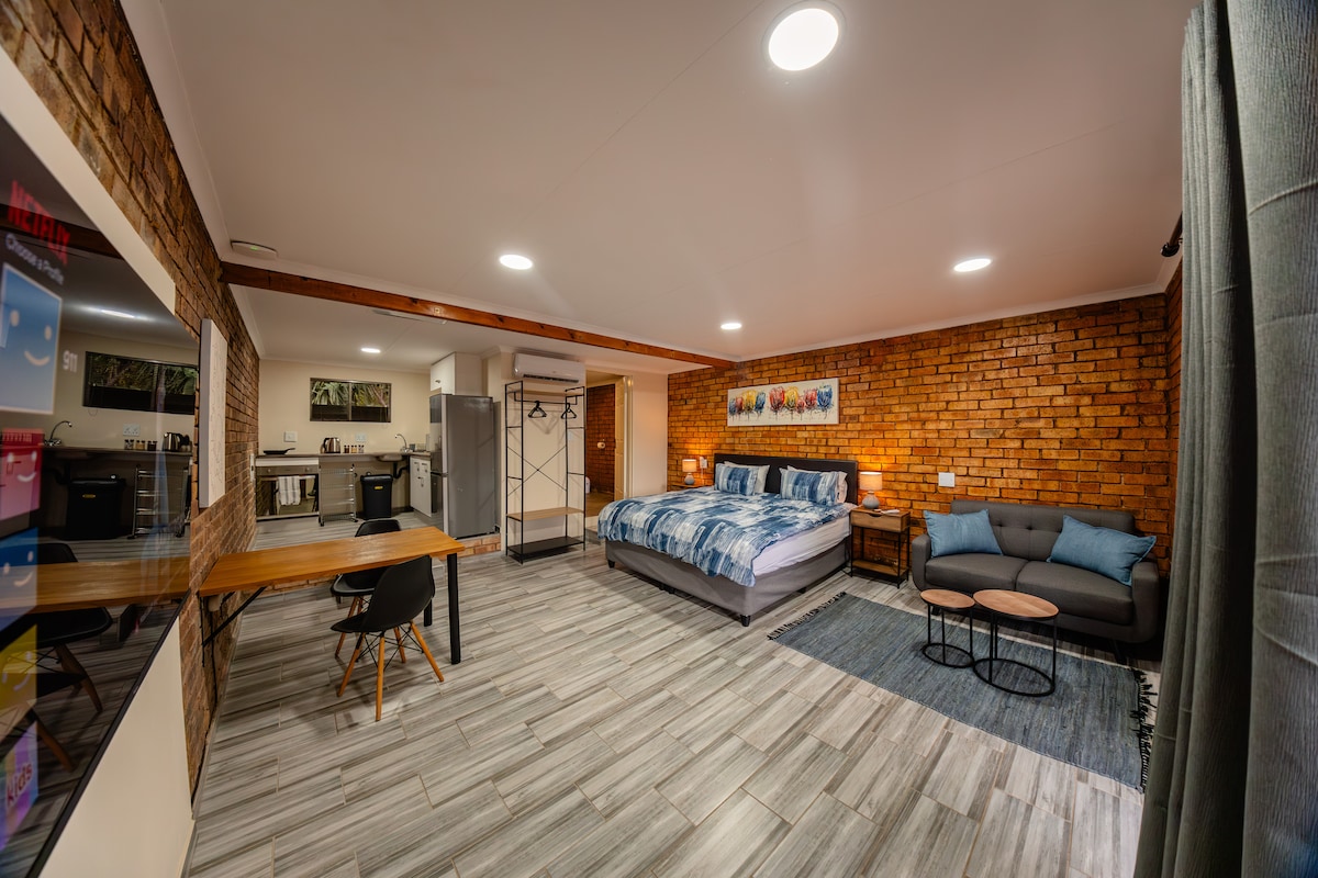 Modern studio in the heart of Poortview. With views onto our indigenous garden, or sit on the patio and watch the horses. Fresh and modern with all the amenities you need. Within minutes of Monash University, Walter Sisulu Botanical Gardens, Lanseria, Cradlestone Mall, MTN and FNB/Wesbank. 5 Minutes from direct highway access (N4) and perfectly situated for exploring the famous Cradle of Mankind. Perfect launchpad for traveling to Sun City, Pilanesberg.