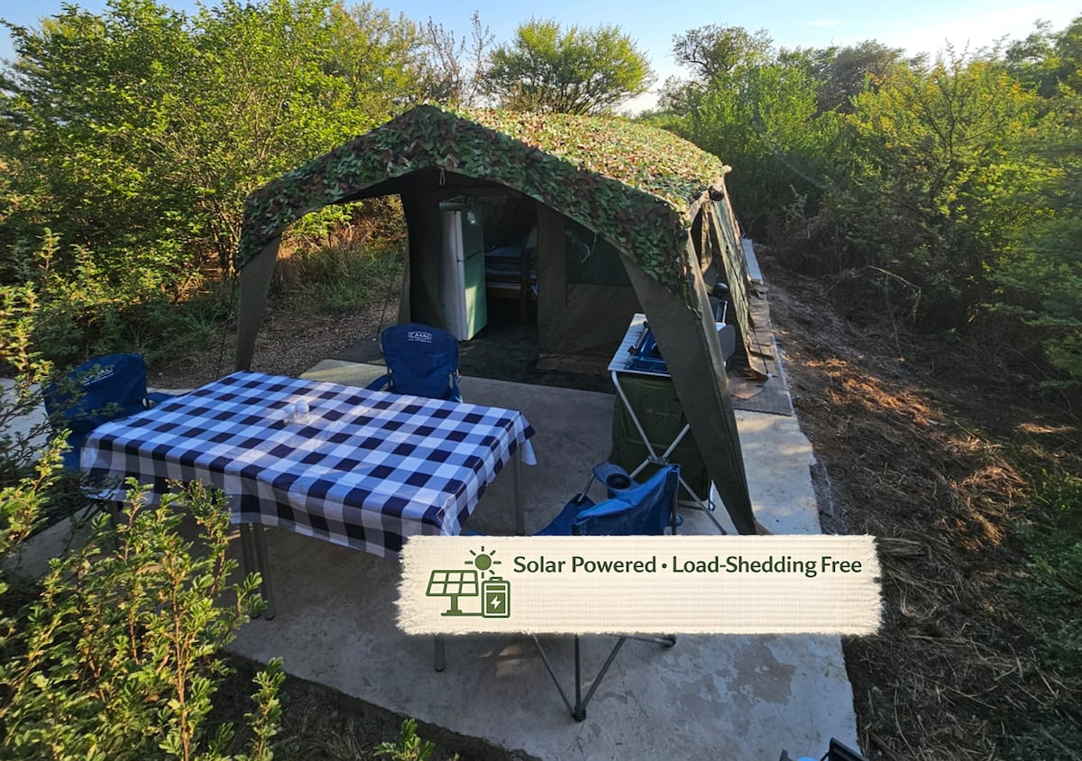 Enjoy the freedom of the outdoors combined with luxury accommodation as your senses feast on amazing views, the sound of birdlife, and the scent of the bush! The Luxury Tented Bush Camp offers self-catering accommodation for 4 guests in 2 bedrooms. The lounge is fitted with a sleeper couch that can accommodate an extra 2 persons at an additional charge per night The tent house offers a bathroom with a shower, a fully equipped kitchen, lounge and dining areas, a patio, and an outside braai area