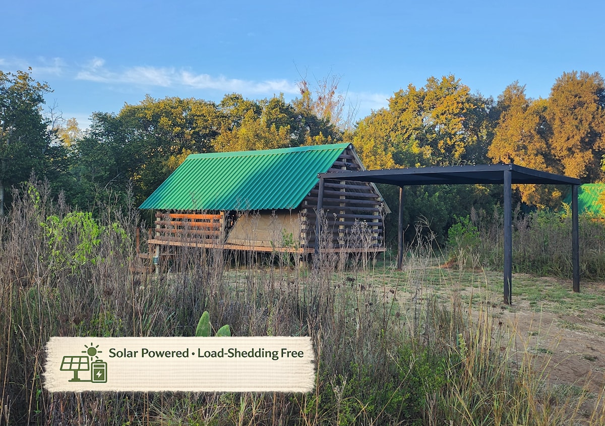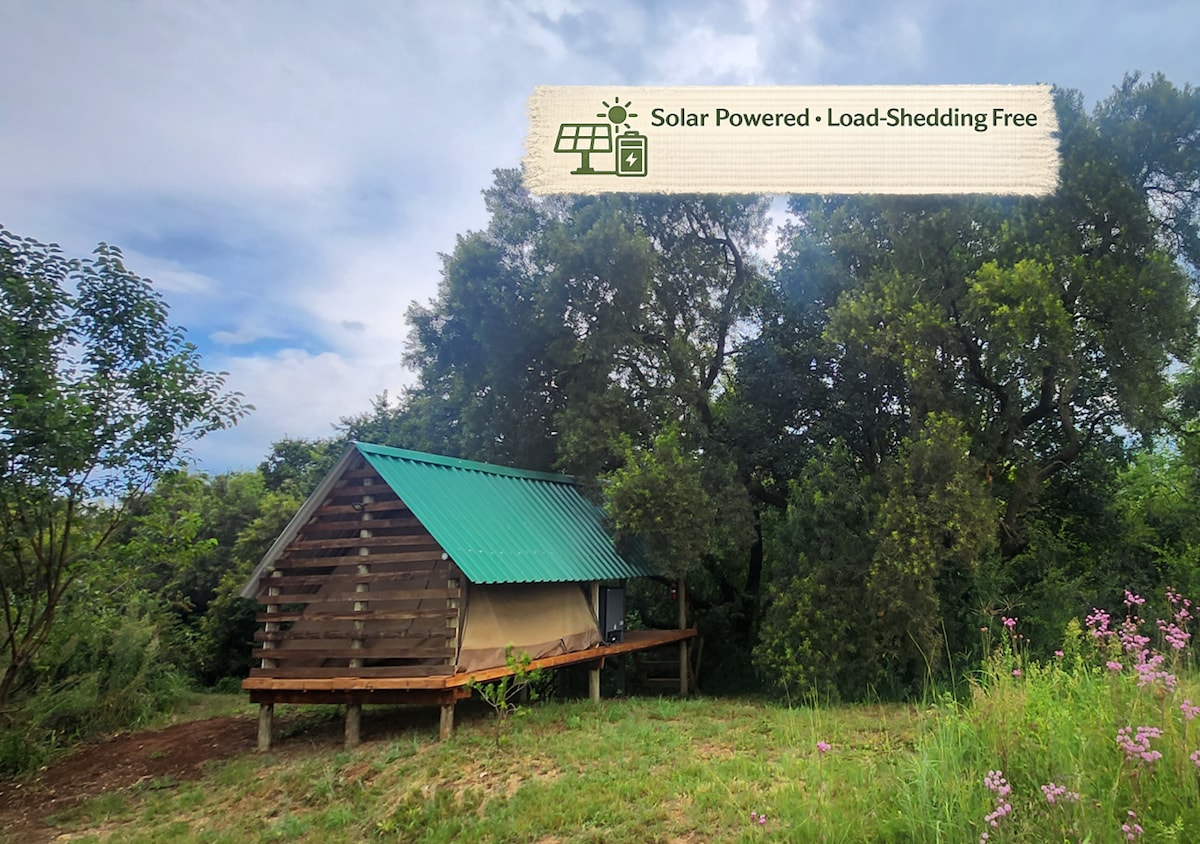 Glamping taken to another level! Modern and luxurious camping next to the Magalies River with 2 airconditioned rooms and en-suite bathrooms. There are also 2 single sleeper couches that can be converted into 2 single beds or one king size bed. Equipped kitchenette and BBQ facility.