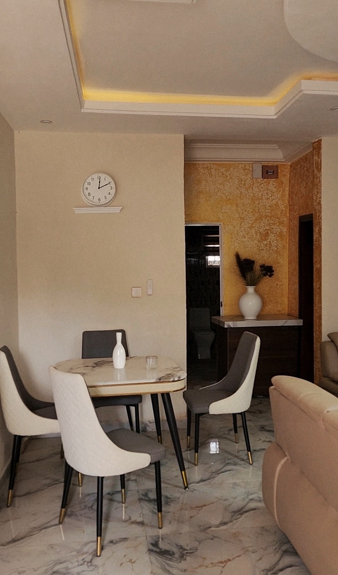 There is a set of leader chairs in the sitting room. The curtains have a transparent lining with good lace. The lighting is bright for reading The ceiling is a shinning lam-brine design and the wall painting is bright cream white oil paint The apartment is located at the base of a hilly landscape with attractive rocks and a water fall located some 1.5km away. There is a weekly sales of cattle about 500m from the apartment. One can view about 1/3 cross section of the town from this point.
