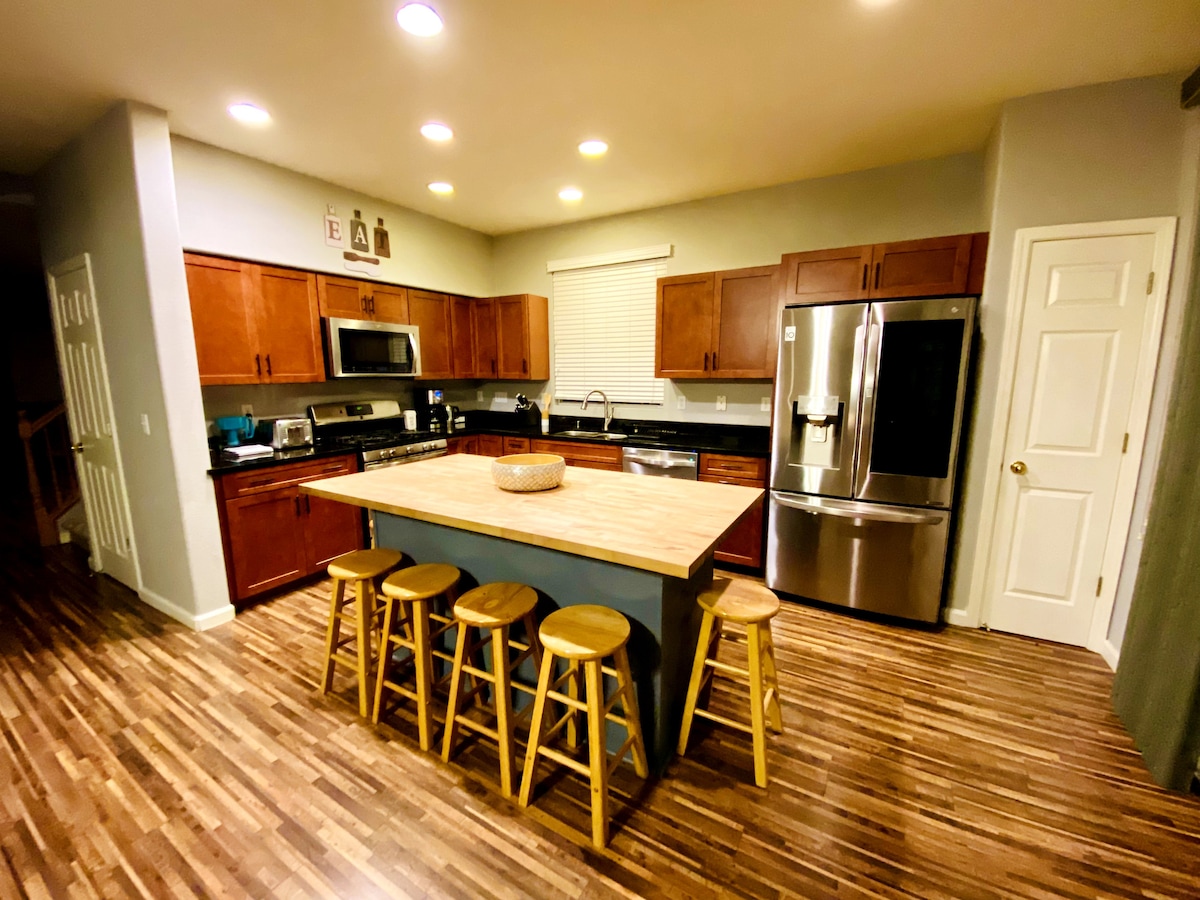 Relax in your spacious 600 sqft private suite upstairs, perfect for families, friends, or professionals. Enjoy your tranquil sleeping area (up to 5 guests), cozy living space, bathroom with a shower & tub. Kitchenette (fridge, microwave, coffee maker), walk-in closet, and work station. With digital locks! Stay connected with fast Wi-Fi, coffee, and cold drinks. Explore nearby parks, shopping, and more. Book your getaway today! No smoking, no partying, no pets. Shared entrance (almost separate).