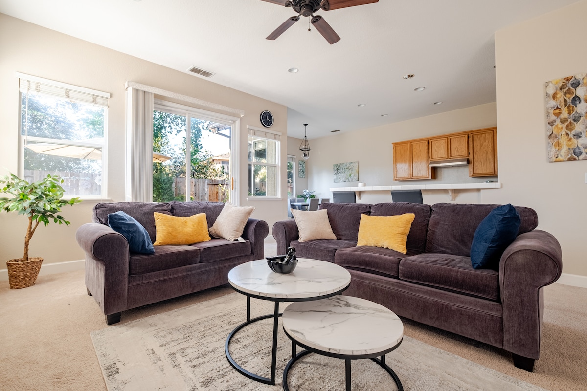 Pack Lighter and wake up refreshed in a quiet neighborhood that's minutes from the best Sacramento attractions! What you will love -Our Reviews Speak For Themselves! -Newly Built, Upscale, & Open Concept! -Fully loaded kitchen! -Games for the whole family! -2000 Sq Ft! (Approx. 185 square meters) -Laundry Room! -5 Min. From Shopping, Rivercat’s Stadium, & Dining On The Sacramento River! -EV Charger -Fenced Back Yard! -Dog Friendly!