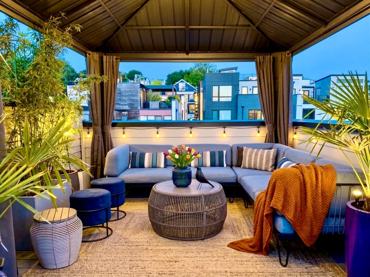 Experience Seattle living where modern urban convenience meets evergreen Northwest nature Corazón Townhouse, nestled in heart of Capitol Hill’s residential core. This "4-Star Built Green" comes w/ FREE parking spot Through modern design&cozy living spaces, you’ll be energized and captivated by stunning rooftop terrace. King ensuite, green backyard, BBQ, stocked kitchen, AC&workspace 96 WALKSCORE—Steps from Trader Joe's, café, dinning&nightlife. Easy downtown/stadium access via light rail/bus