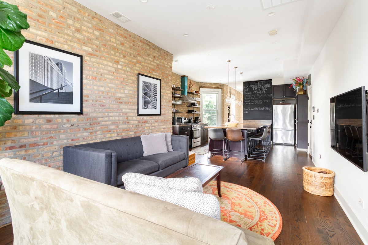 Dim the lights, play chilled tunes through the Bluetooth speakers, and snuggle up on the caramel suede sofa at this welcoming home. Wander the polished hardwood floors, pluck spices from the open shelving, and serve dinner on the kitchen island. Cleaning fee is $350 for stays of 30 days or less; additional Flat $150 per 30-days for longer term stays. Also, check out our other two listings in the building. Soft Leather & Warm Bricks in Stylish New Home: airbnb.com//h/softleather-warmbricks Soft Palate & Warm Bricks at a Rogers Park Home: airbnb.com//h/softpalate-warmbricks Meet NEW and CHARM with exposed brick,dim LED lighting,rainfall shower with bluetooth wiring, In-unit washer/dryer, open shelving, gourmet kitchen seats 6, stainless steel appliances, wood counters,5 range oven w/Broan hood, soft close cabinets,coffee machine or walk to Starbucks or french coral coffee around the corner. Grocery store(Jewel),Dry Cleaners(will provide you with a discount for staying at The Clark),UPS,Walgreens, Marshalls,LA Fitness, wine shop,Red Line, Metra, CTA Transportation,Evanston,Lake,Beaches, and Restaurants all in walking distance.Loyola and Northwestern 10 minutes away...Only bring your clothes and your ready to go! Free Wifi,Keyless Entry,Towels,Bedding,Ready to cook kitchen, 1 Free Parking space and $25 per diem for each additional vehicle. The entire unit is for your guests alone. Not a shared space. Reservations are set for(4) four people. Additional charges of $40 per person per diem applies. Space accommodates up to 6 guests. Chicago is an Amazing City and I'm here to answer and help out any way I can. Meeting guests upon their arrival is what helps guests become acclimated with the space and provides a sense of comfort. Of course, there are those moments that our schedules will have a conflict due to delayed arrivals with travel and guests will check in on their own, with a four digit code, of their choice. It’s a keyless entry that will allow guests to enter the building and unit smoothly. Guests will always be able to access us for whatever they need. Any issues that arise, need to book another day or two and questions about the city or for recommendations. The condo is five blocks from the lake with its beaches, bike paths, running, and peaceful places to read the morning paper with a cup of coffee. Walk just one street to the CTA Red Line train, which connects to virtually anywhere in the city. La Fitness is across the street for your convenience. Ohare international Airport-25 mins with light traffic. 45 mins with traffic. Take Mannheim Rd N to Thouy E to Clark N to property located on the left hand side. Midway Airport-25 min with light traffic. 45 mins with traffic. I55 N to Lake shore Drive/ (Route 41)N to Sheridan Rd to Howard W to Clark S to property located on the right hand side. Red Line (L Train-CTA) 1 block East of property Bus Line (CTA)-Outside in front of the property Metra -4 blocks North or South of property Kitchen area desk is equipped with a USB electrical outlet for your convenience, as well as all three bedrooms (north walls). Both bathrooms are equipped with Bluetooth to pair your music while getting ready.