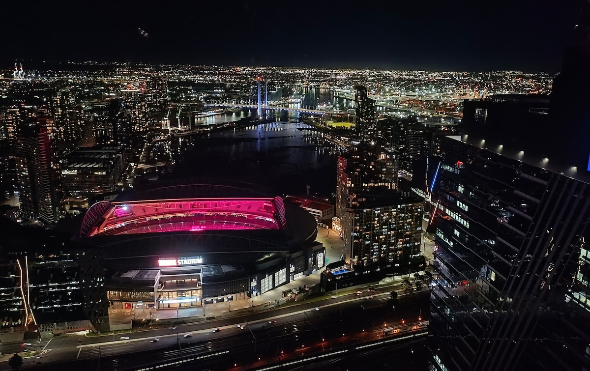 Perched on level 70 above Melbourne's skyline, this luxurious 2-bedroom, 2-bathroom apartment boasts vibrant upscale furnishings, panoramic views, and seamless living space. Located in the heart of Melbourne CBD within the West Side Place complex, alongside the Ritz Carlton, it offers world-class amenities. Enjoy fully equipped kitchen, ensuite with bathtub, and easy access to city's attractions. Ideal for both leisure and business traveler seeking style and convenience. Book Now to enjoy!