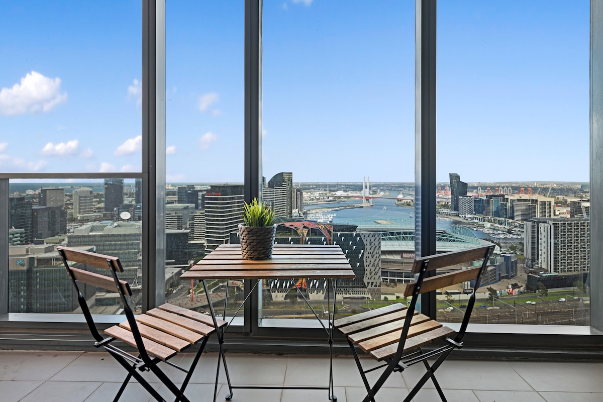 Luxury high-floor 3-bedroom apartment with stunning Melbourne skyline views through floor-to-ceiling windows. Perfect for families, groups, or business travellers seeking a stylish and comfortable city stay. Located next to Spencer Street Outlet and just minutes from the CBD, Southern Cross Station, and Bourke Street Mall. Enjoy modern interiors, spacious living areas, and access to building amenities including a pool, gym, sauna, and steam room.