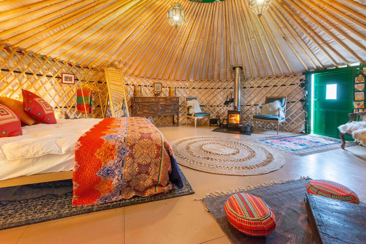 Hand built by myself & Granny Mongolia, the Yurt is a mix of traditional Mongolian design & bohemian chic. As you enter the yurt you will instantly notice a sense of calm & grounding, an ideal retreat from a hectic lifestyle. Surrounded by countryside, the yurt is home to many Mongolian artefacts gifted to me by Granny Mongolia. It features a charcoal bbq & stove. Outside there is a large dining area, outdoor kitchen & outdoor bathroom. Child friendly space. As seen on BBC2 My Unique B&B.