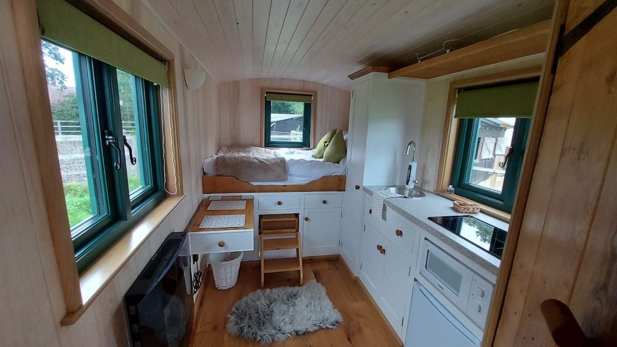 This traditionally inspired, hand-made Shepherds Hut is nestled inside a paddock in the leafy county of Hampshire. It offers a tranquil retreat in a home away from home setting with a cosy open plan living space championed by the log burning stove. Enjoy cooking your own English Breakfast - of which eggs are graciously supplied by our chickens -amongst views and visits of our 17 strong Alpaca herd. Please let us know if you'd like to meet and feed the Alpaca - they'd like to meet you!