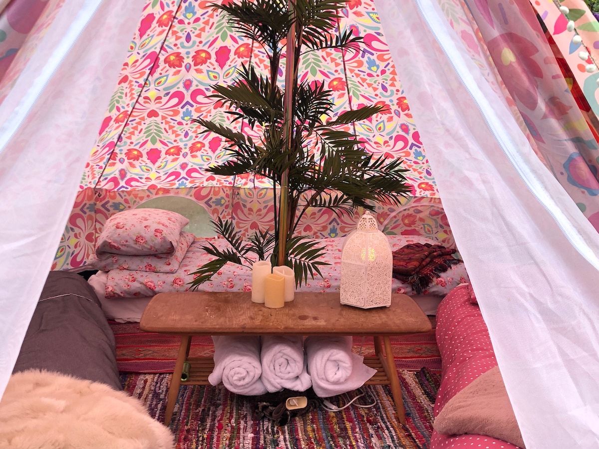 GLAMPING AND CAMPING - Unique glamping and camping options available This is ideal for 2 people, the tent consists of a double bed ( bedding supplied by yourselves) battery operated candles and lights, rugs, and bed side cabinets. Outdoor space, fire pit, bbq, with table and chairs on the decking, another table and chairs in your own private area and a portable loo at an addition charge. Air beds can be supplied for children at an extra charge. There is a communal bbq close by. Wood to be collect by yourselves and utensils supplied by the campers. Noise, campfires and music is restricted.