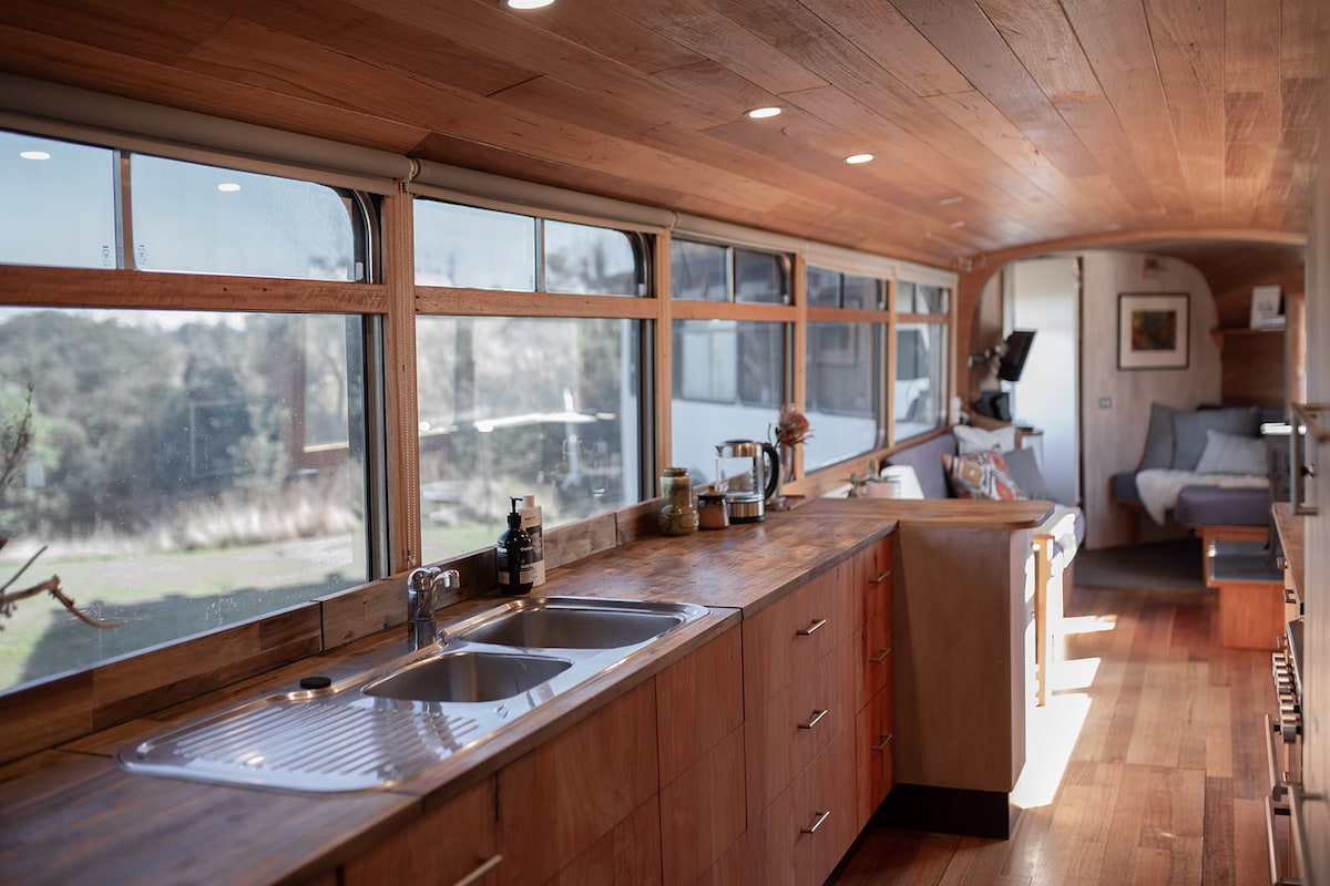 **As featured in DOMAIN LIVING, INSIDER and DAILY MAIL** Our ethos of simple and sustainable living is what inspired us to begin the journey of creating our bus home. We have up-cycled, second hand materials, handmade items, sourced local products and have aimed to be conscious in our purchases to create a unique home. Much thought and creativity has gone into the custom made furniture and design layout. This unique bush retreat is the perfect hide away. Experience bus home living.