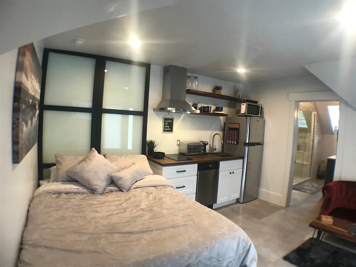 “Sugar Loft” Studio is truly a one-of-a-kind sanctuary atop a late 19th Century Victorian home in the heart of Sugar House, with your own high-level deck for you to relax & recharge or sip wine while watching the sunset! Every square foot is maximized for convenience with ultra-modern touches that make it ideal for the single business traveler or cozy couple. It's conveniently located near Westminster College and 9th & 9th District, areas filled with hip restaurants, locally owned shops & more!