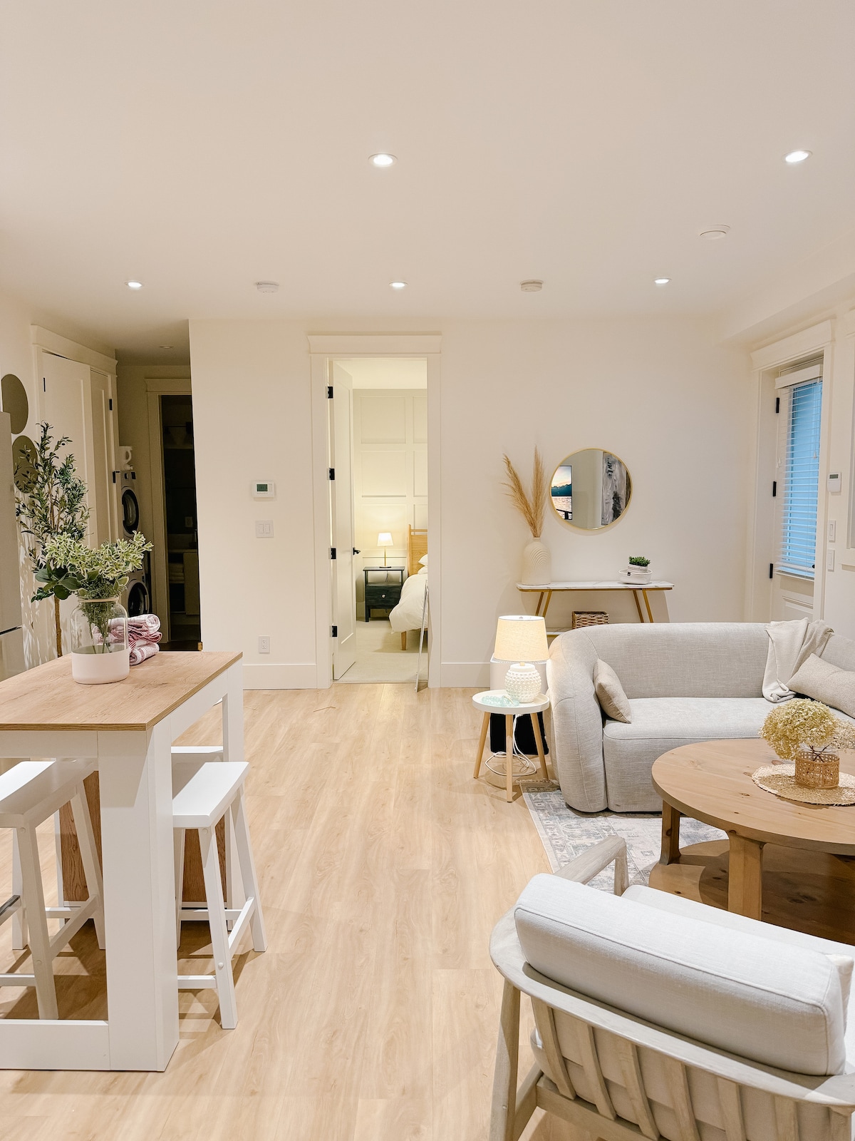 Bright brand new one bedroom suite with street level private access. The suite comes with a queen size bed in the bedroom and a double size sofa bed with memory foam mattress if you need extra sleeping space. Fully stocked kitchen with stove, oven, microwave, coffee maker, toaster, and much more. This suite has its own washer/dryer and dishwasher. The bathroom comes with a large rain shower. The suite is 5-minute walk to bus stop, beach, playgrounds and 15-20 minute drive to local mountains.
